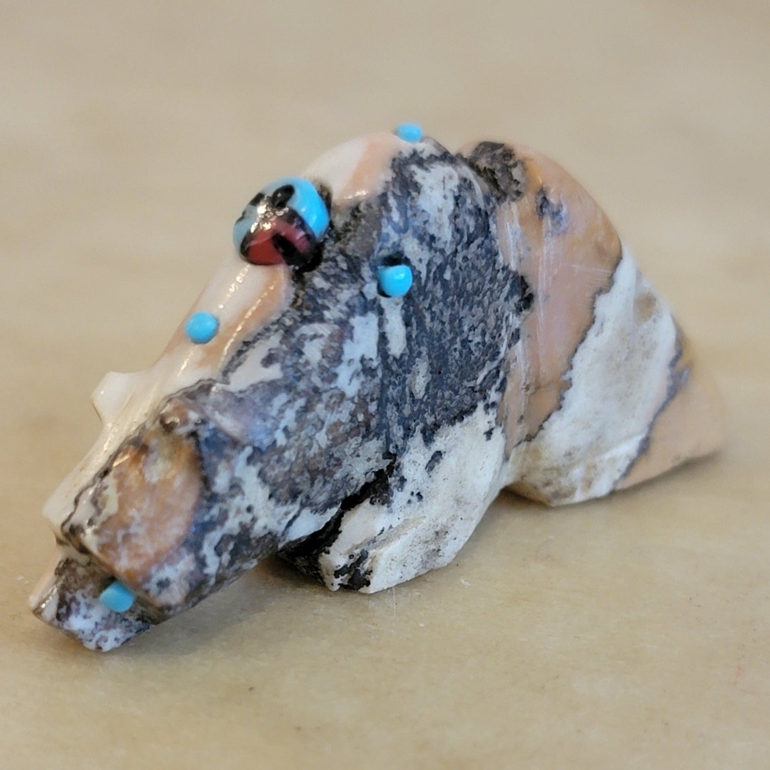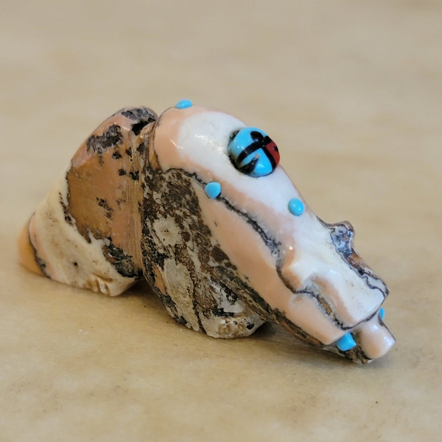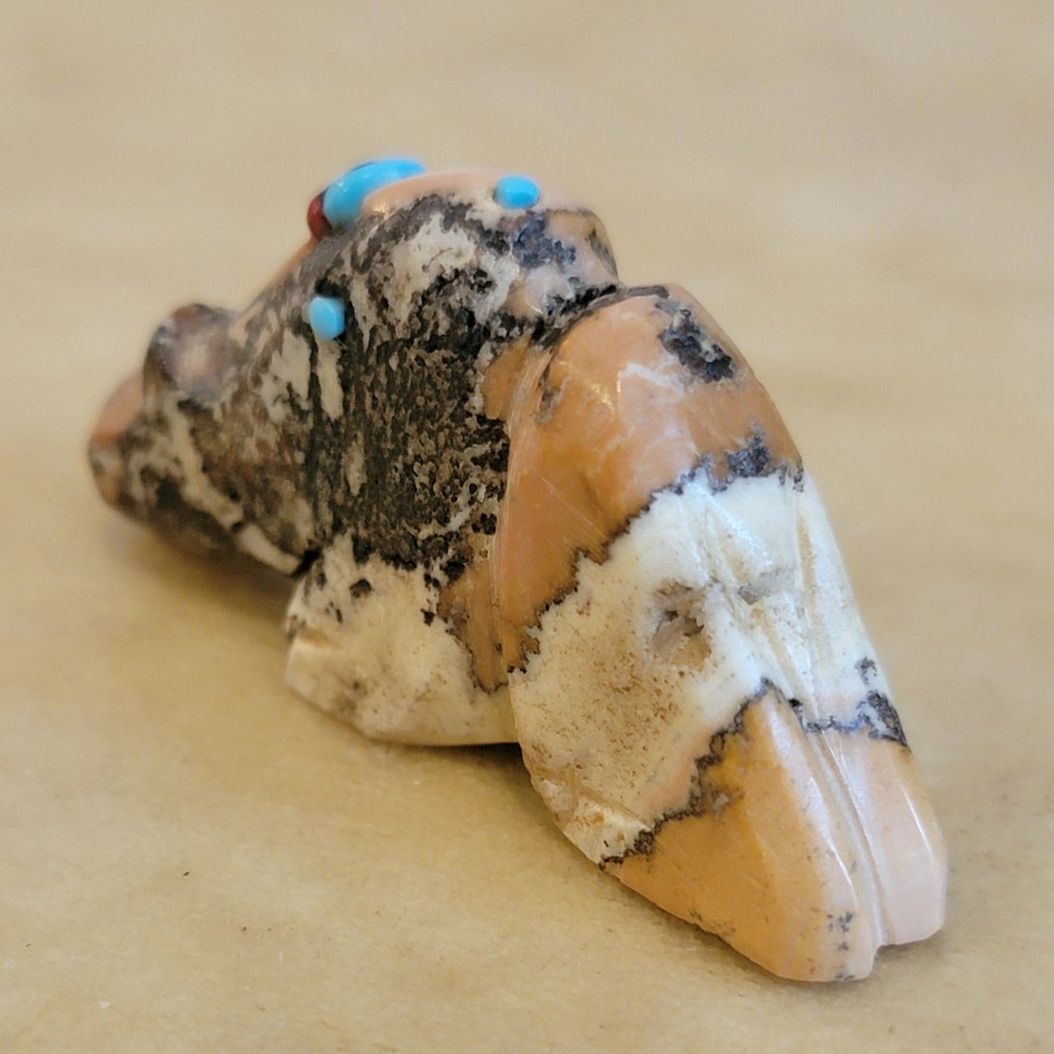 Medium: Tijillite with turquoise eyes and appointments/ Inlaid jet, coral and turquoise Zuni sun on humped back