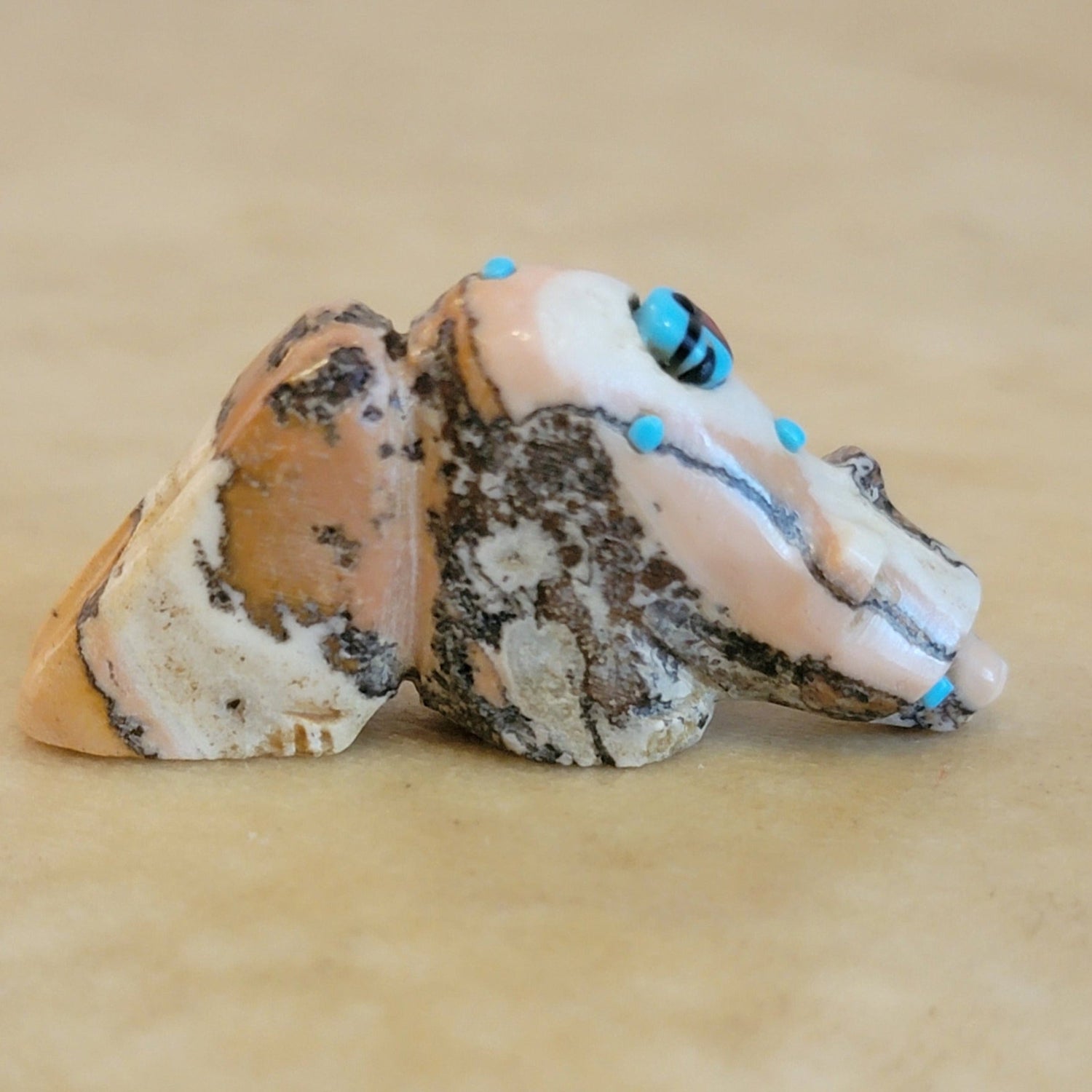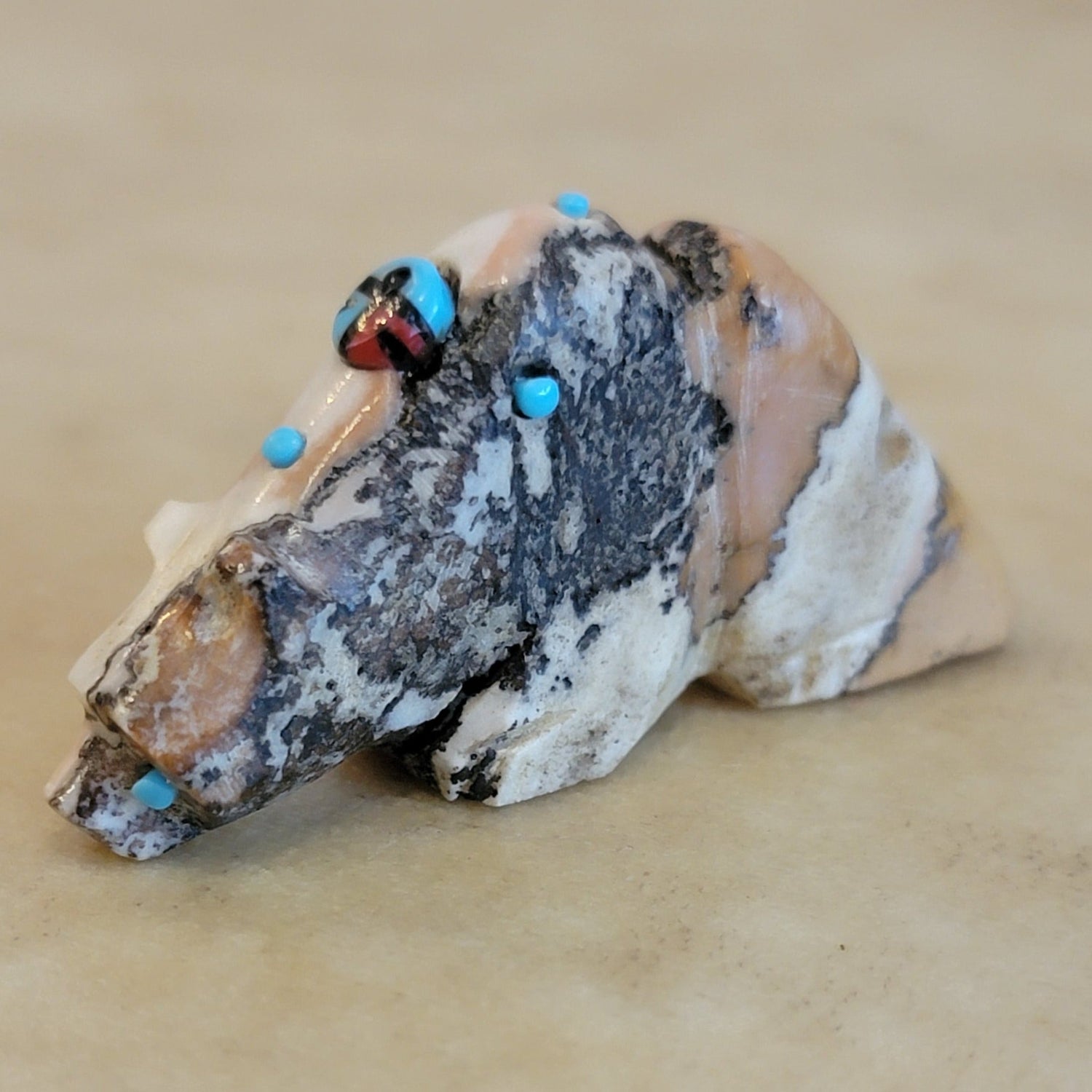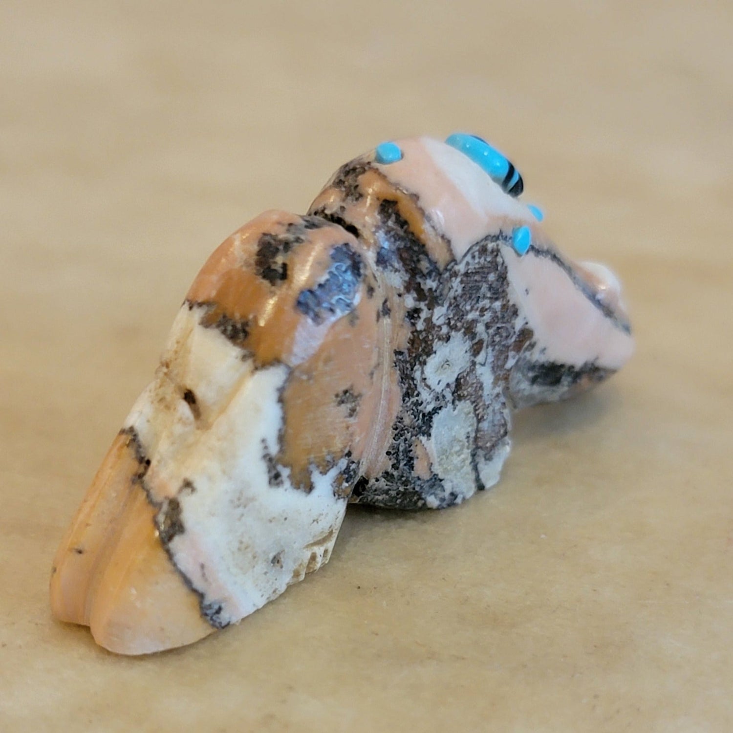 Medium: Tijillite with turquoise eyes and appointments/ Inlaid jet, coral and turquoise Zuni sun on humped back