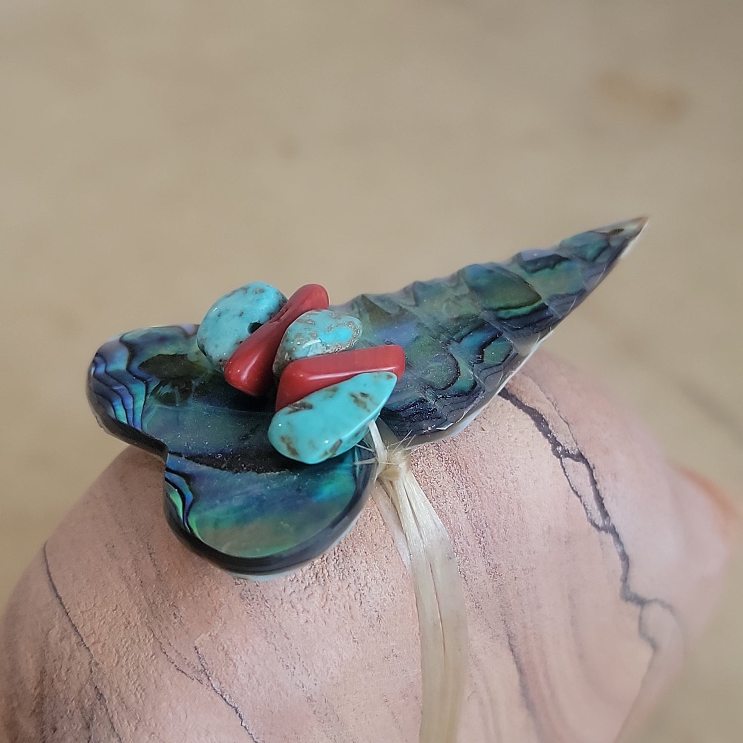 Medium: Sandstone with beautiful markings/Turquoise eyes/ Large abalone shell arrowhead with turquoise nuggets and deep red ox blood branch coral pack