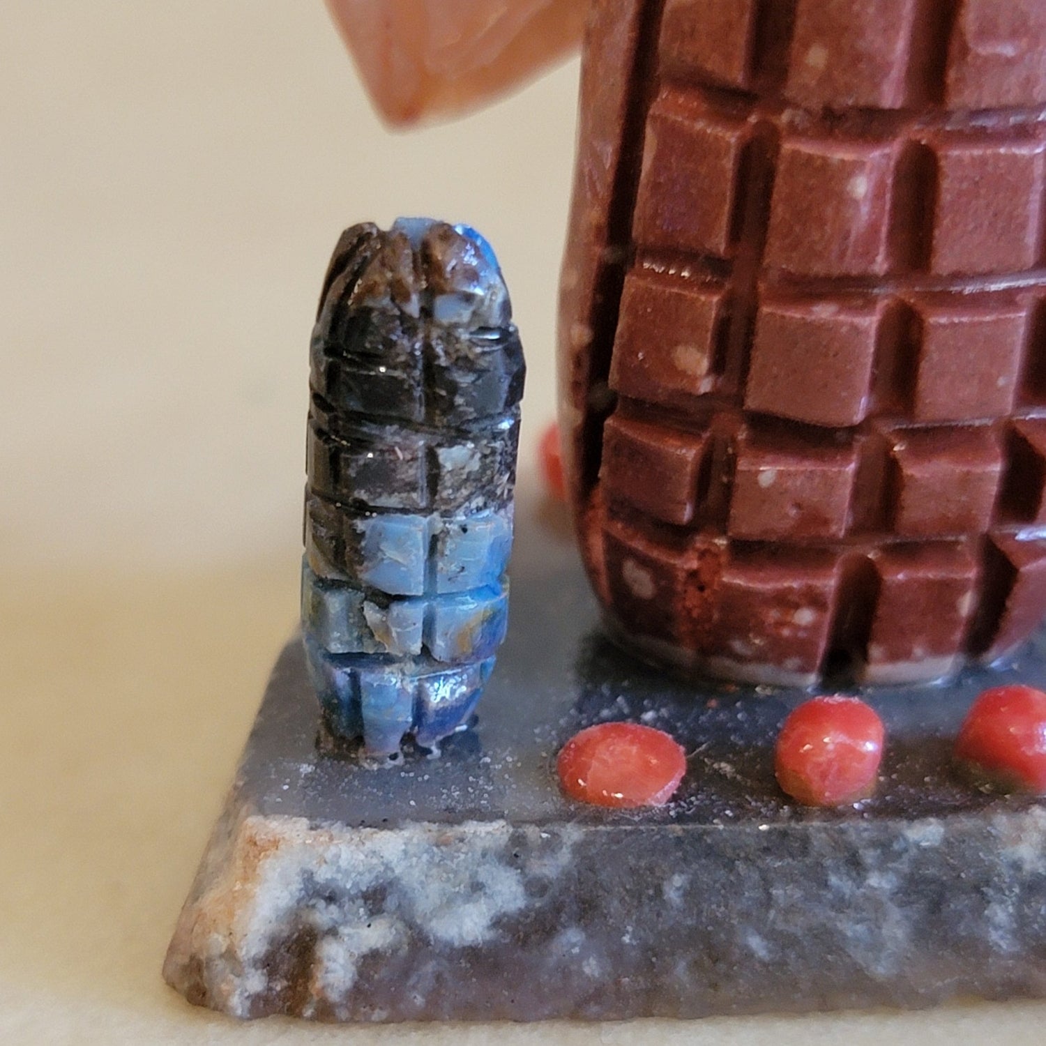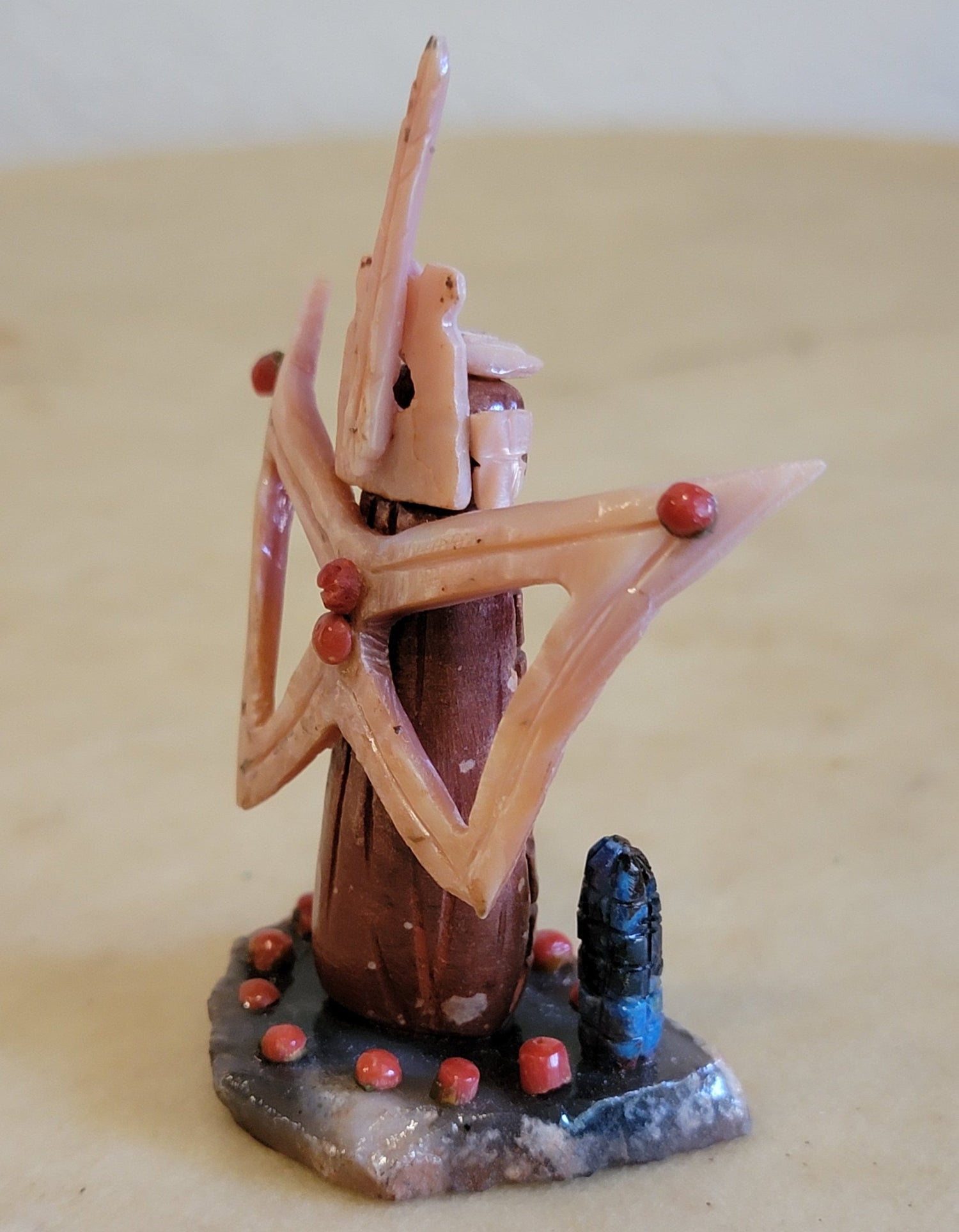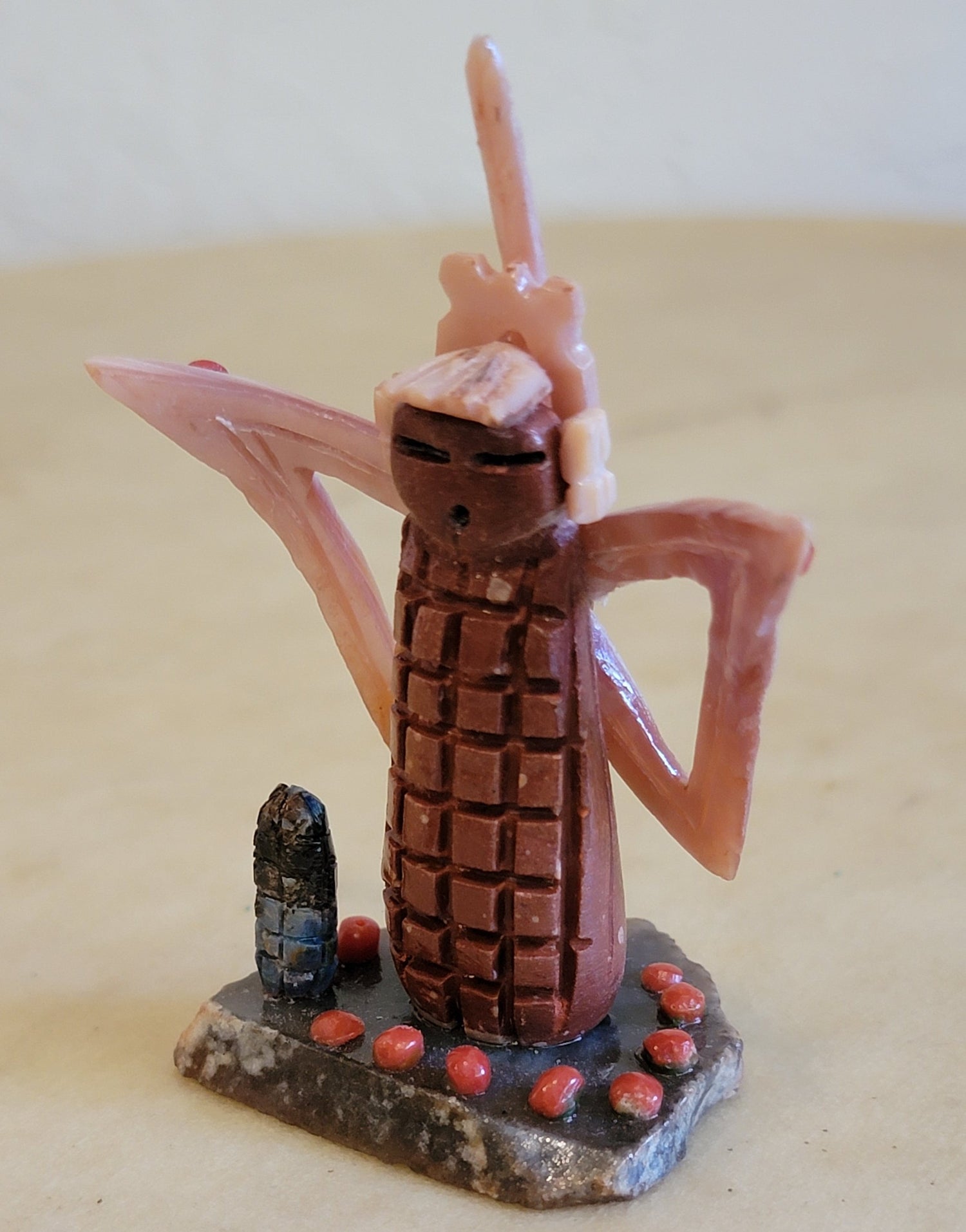 Medium: Pipestone Maiden with Pink mussel shell tablita / hair/ butterfly wings. Jet eyes and mouth. Septarian nodule base with multi deep red coral appointments/ Sodalite carved corn on base/ Coral appointments on wings