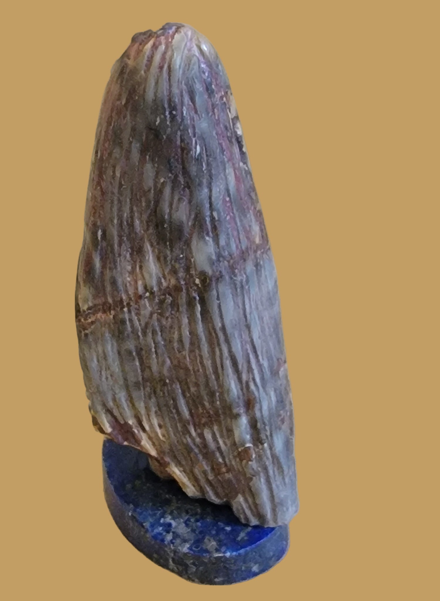 Medium: Serpentine with Spiny Oyster Shell face/ Jet eyes and mouth/ Jet dragonflies and stars on shawl/ Turquoise, coral, moonstone and jet appointments in various sizes /Deep blue Lapis base