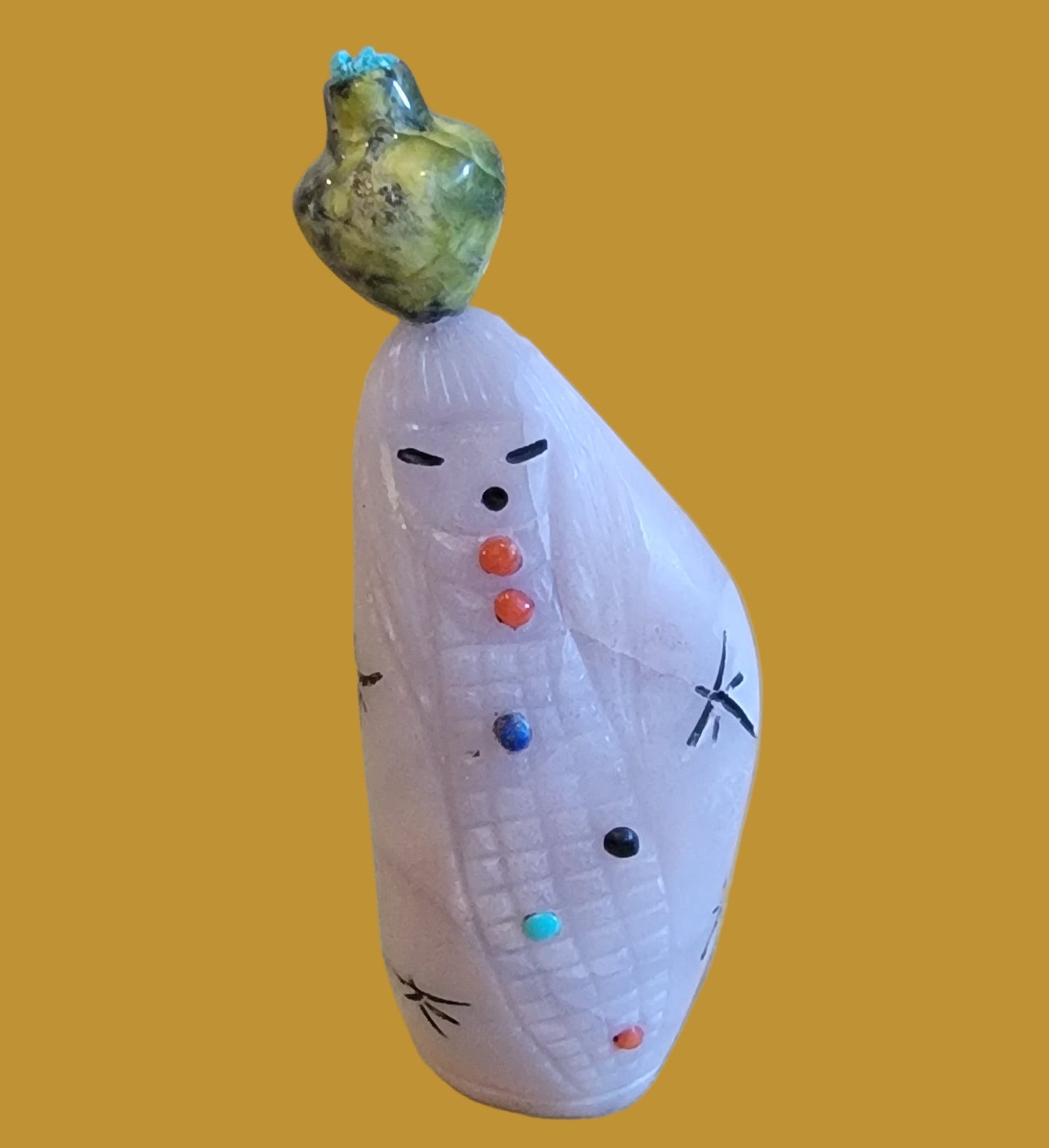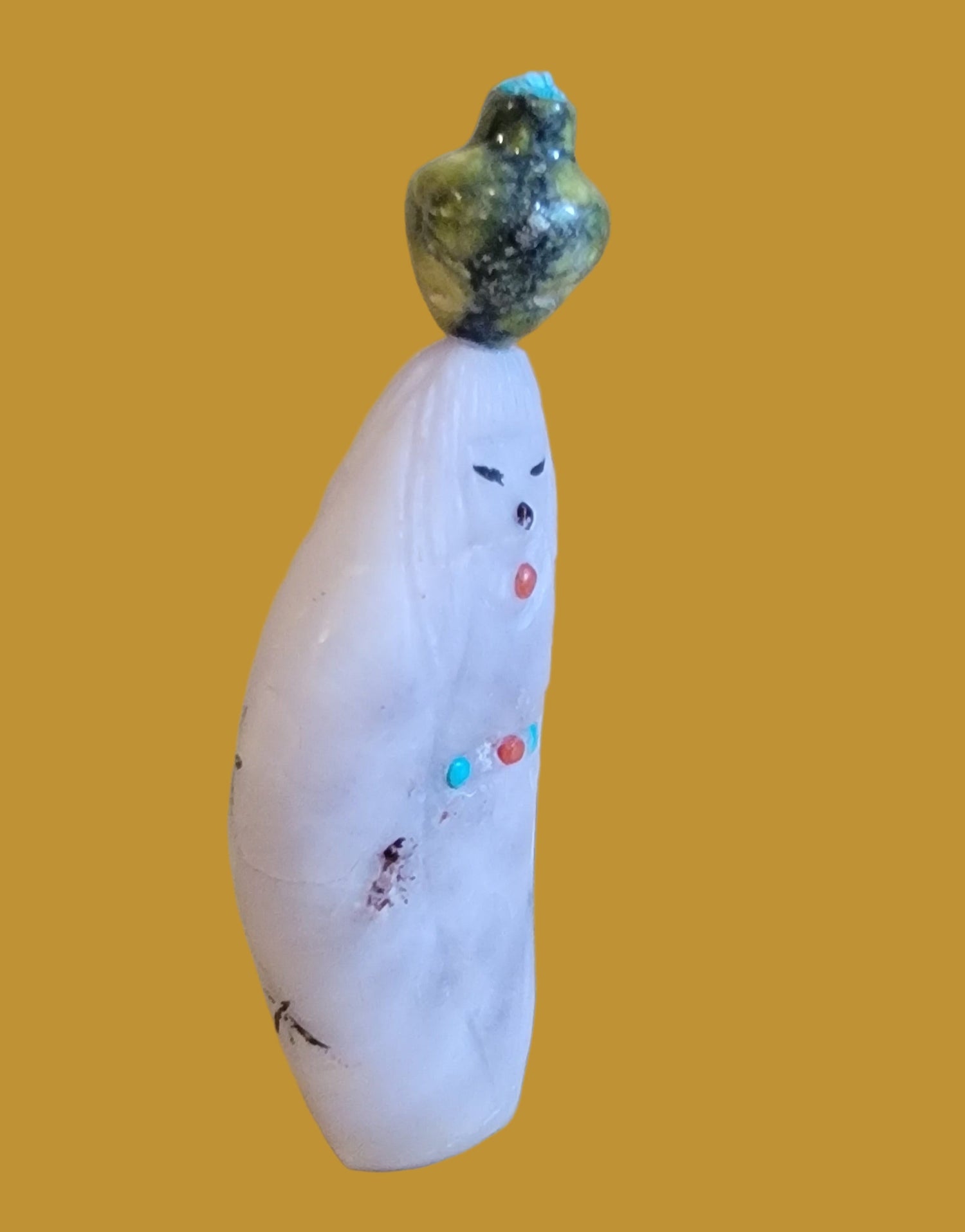 Medium: Fluorite with jet eyes and mouths/ turquoise, lapis, jet and coral appointments/ Jet dragonflies on shawl/ Serpentine Olla with Chip turquoise