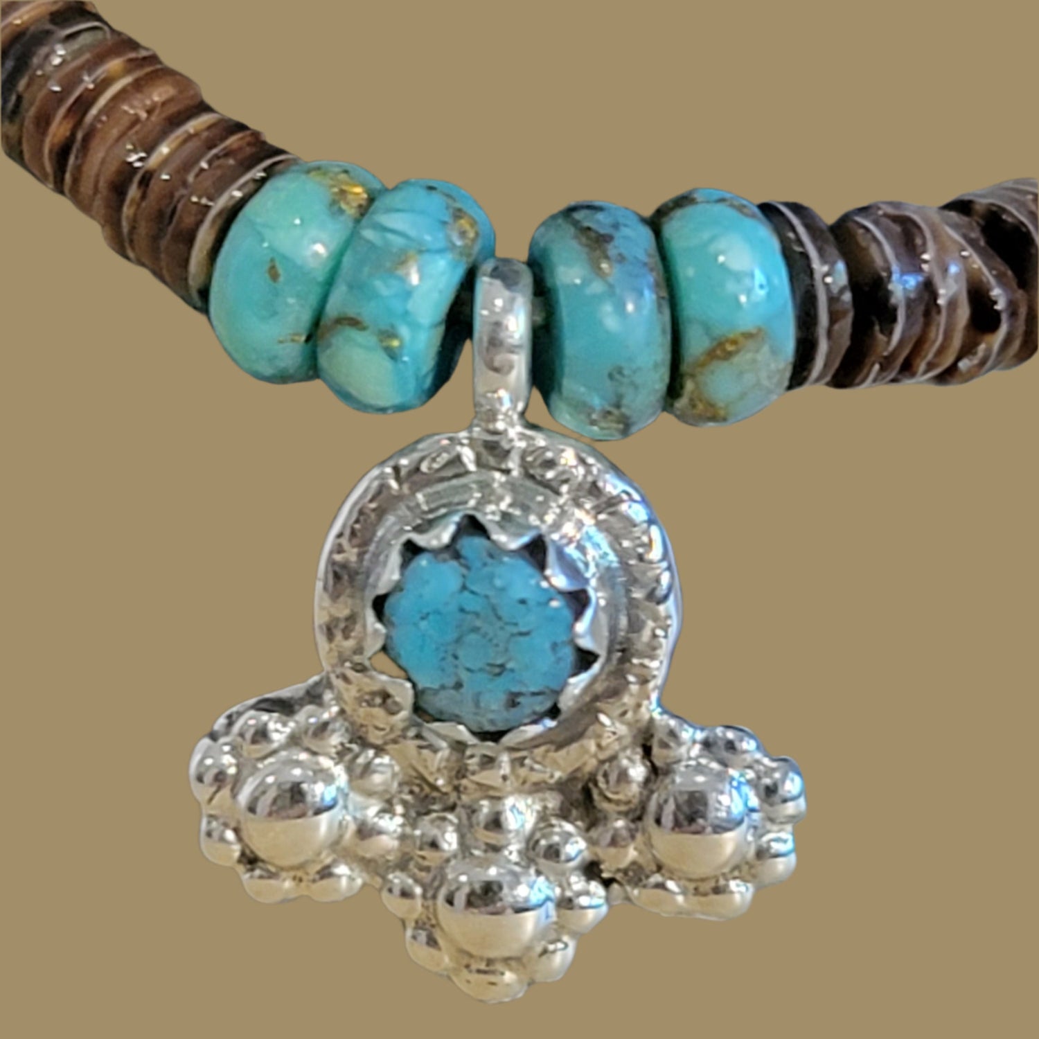 Medium:  Sunset Sodalite with gold lip and jet eyes/ olive shell heishe with turquoise slabs and sterling silver with turquoise center stone necklace!