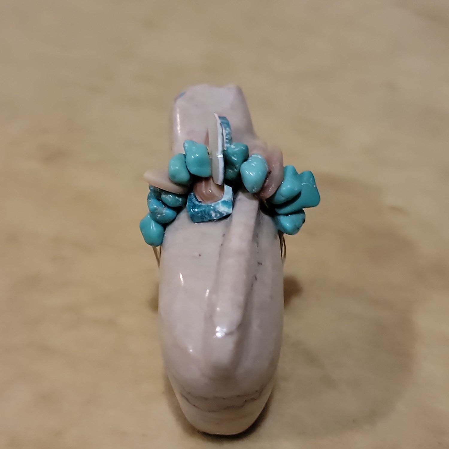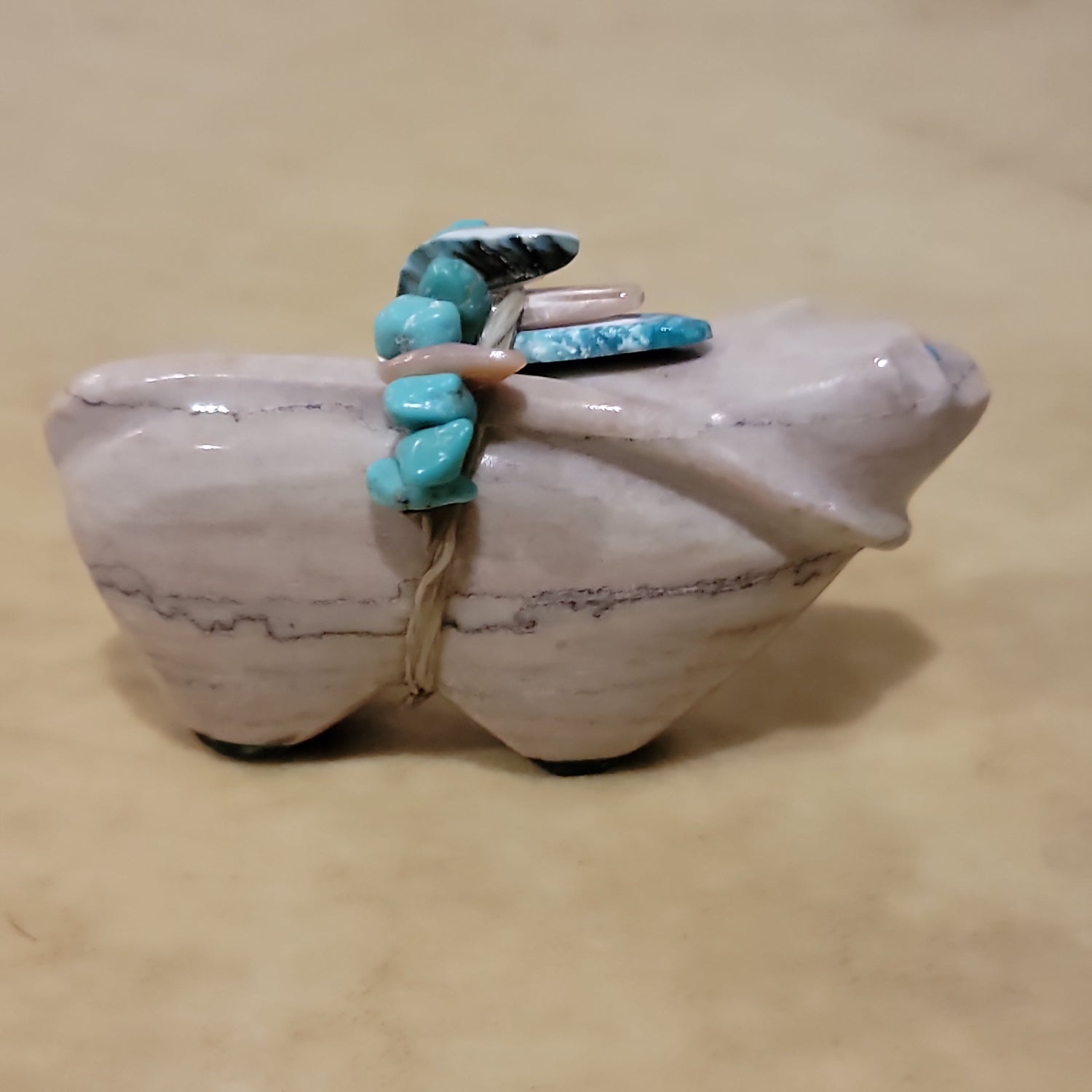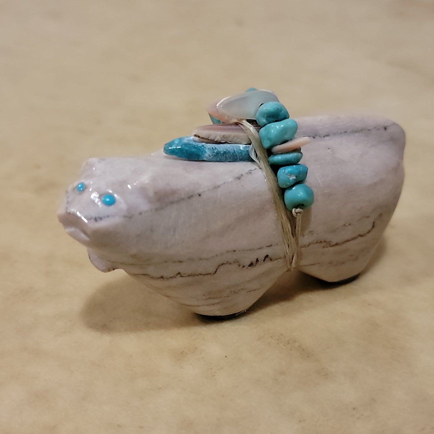 Medium: Dolomite with turquoise eyes/ Turquoise arrowhead with shell and turquoise nuggets and green snail shell wrap offering/ Jet feet