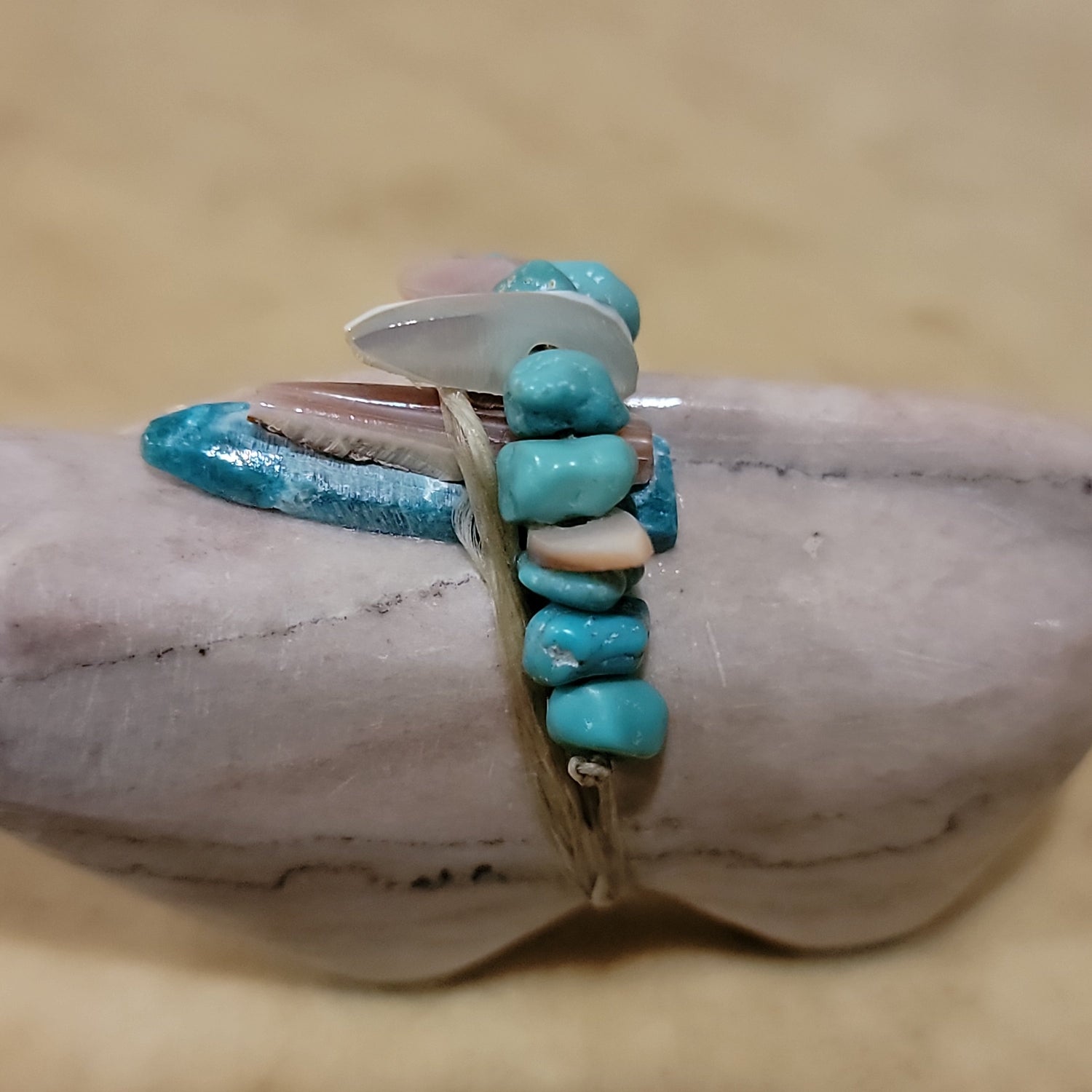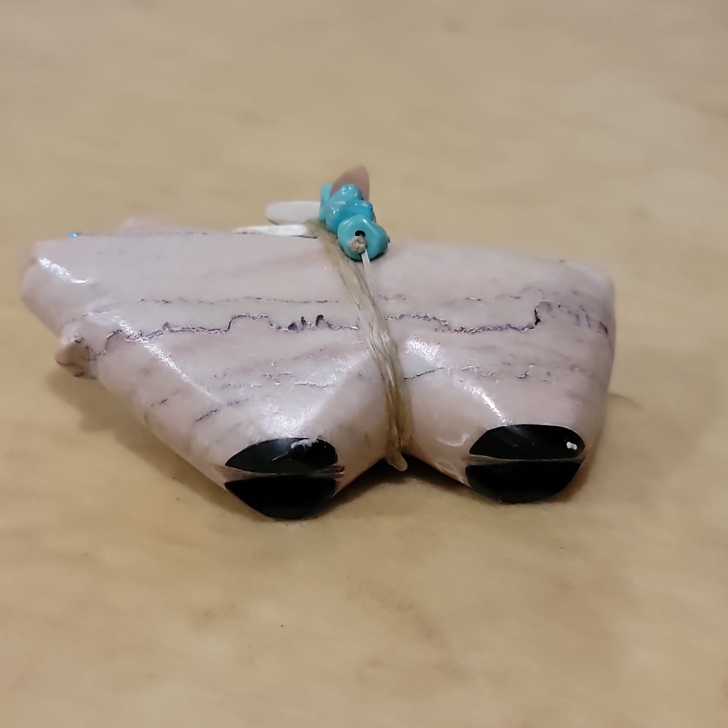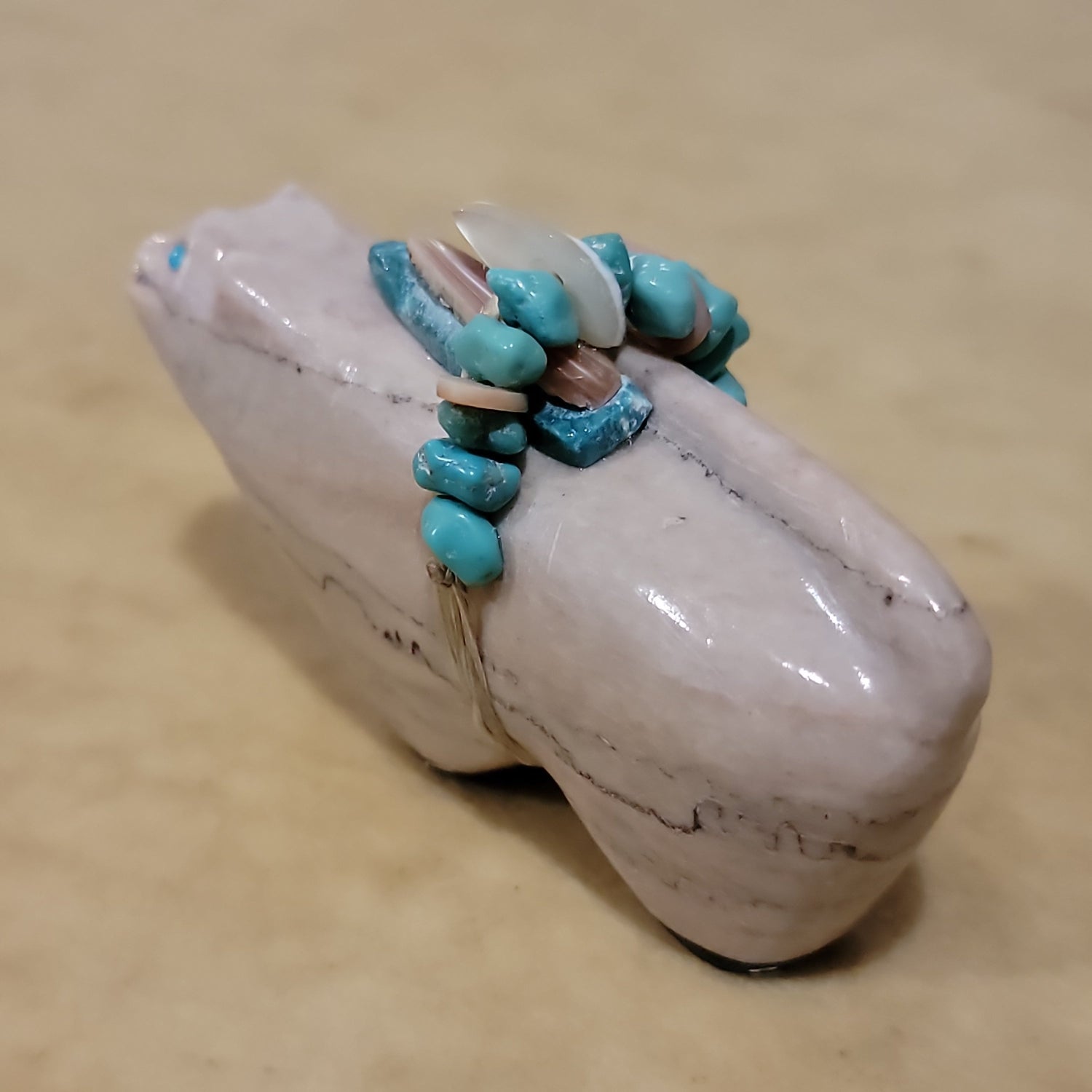 Medium: Dolomite with turquoise eyes/ Turquoise arrowhead with shell and turquoise nuggets and green snail shell wrap offering/ Jet feet