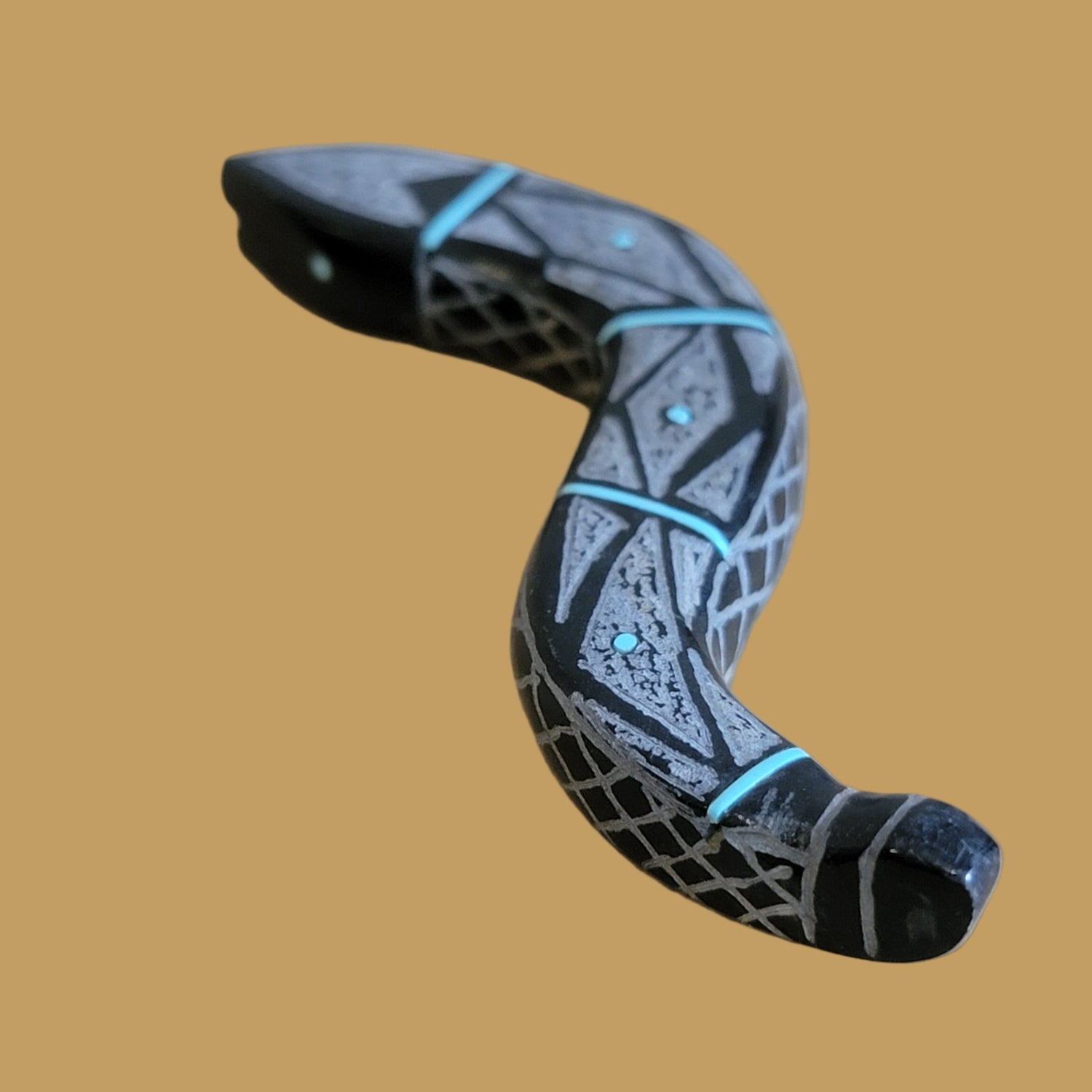 Etched and Inlaid Black Marble Snake Zuni Fetish
