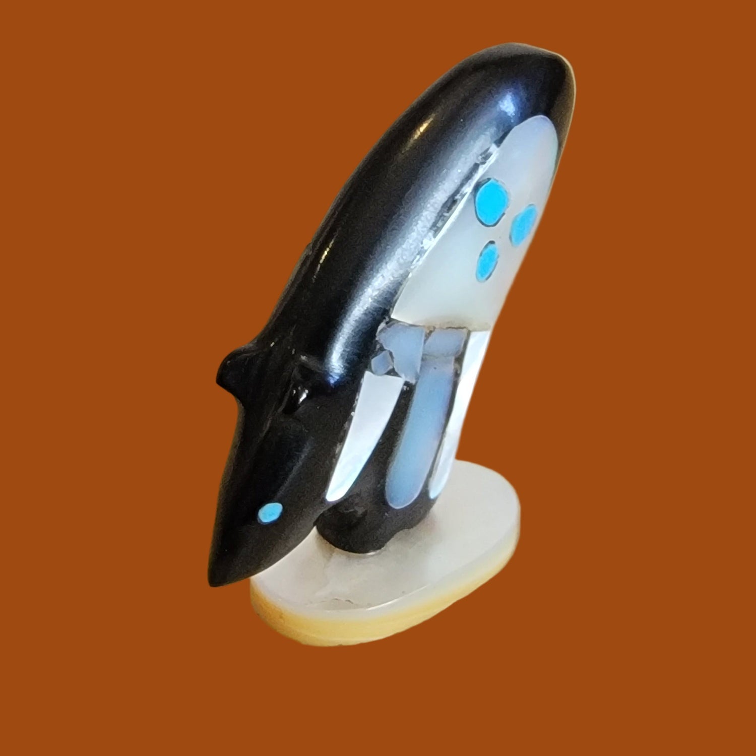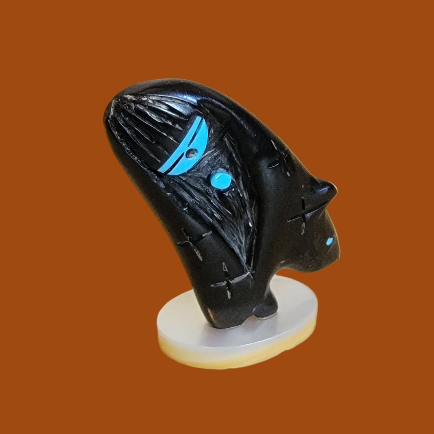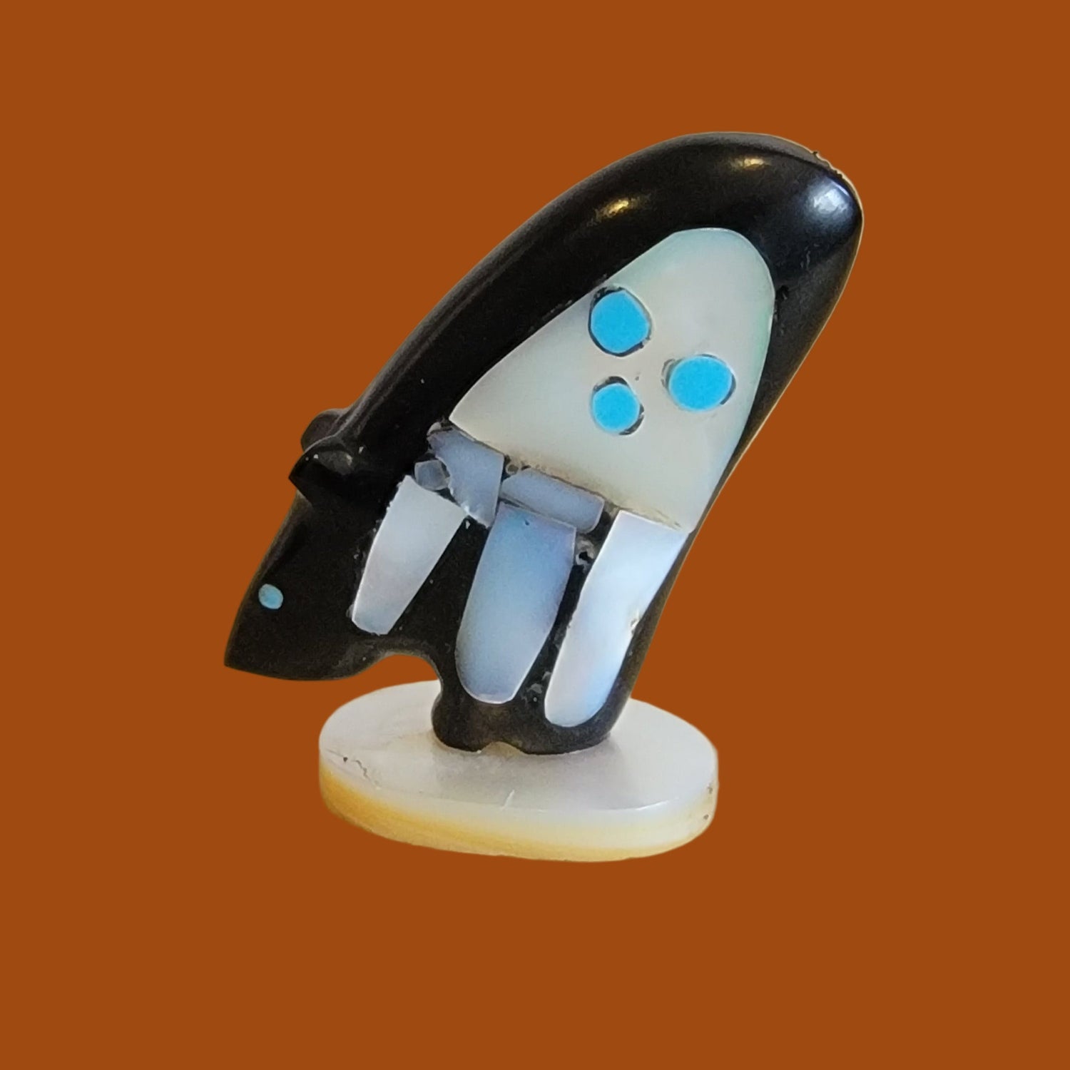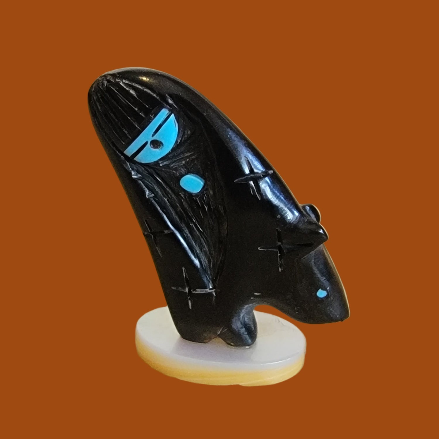 Medium: Jet Bear with Maiden on one side with turquoise face with jet eyes and mouth/  Turquoise eyes on Bear/ Opposite side has mosaic inlay  with mother of pearl ghost with turquoise eyes /Base is of gold lip