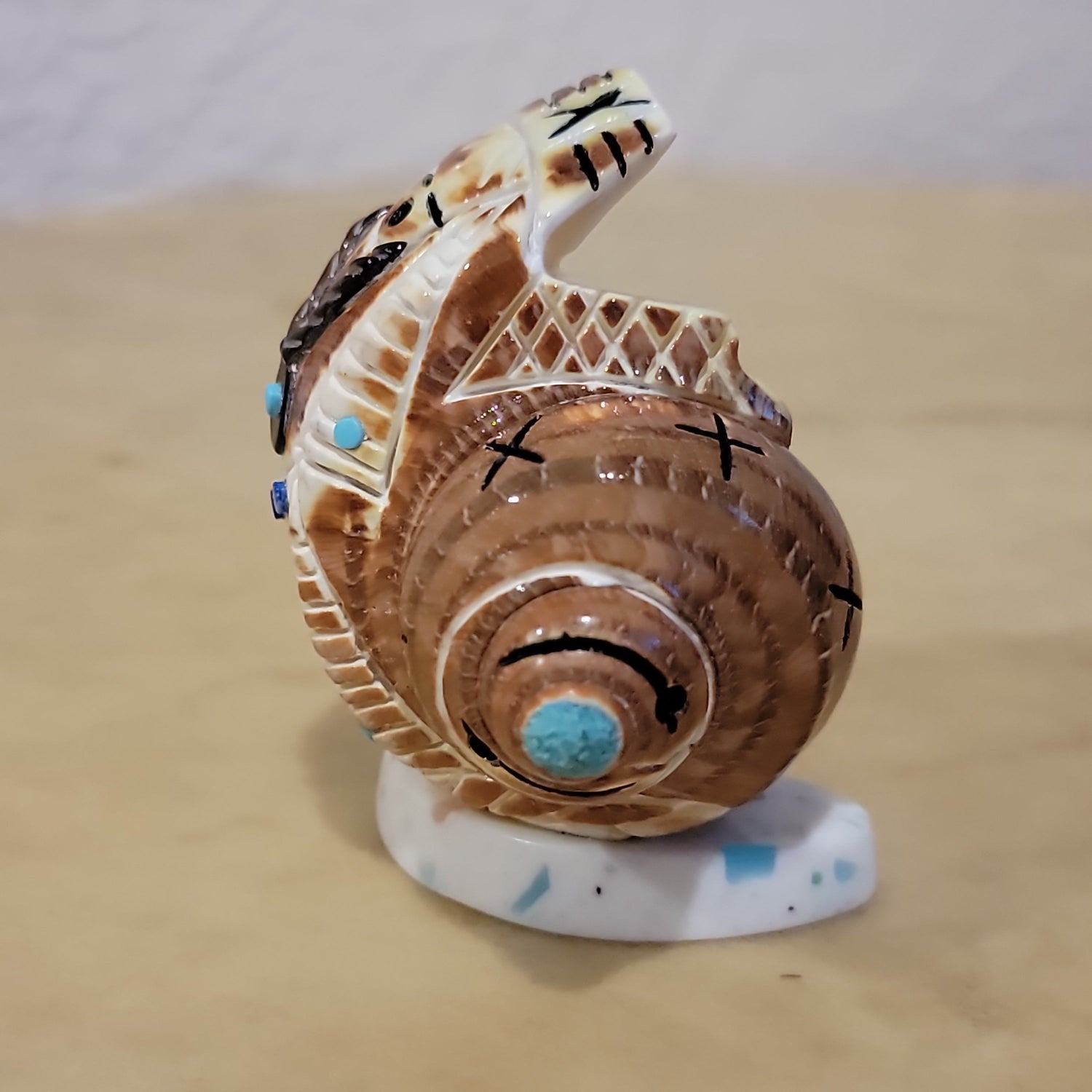 Medium: Natural Snail Shell Maiden with inlaid jet eyes and mouth and appointments/ Pinshell necklace with turquoise center stone/ etched dragonflies and traditional patterns on turquoise adorned shawl/lapis stones at waist/ Chip Turquoise on shell tip/ Bowlerite base
