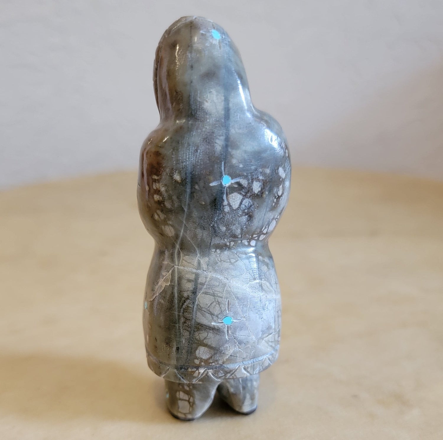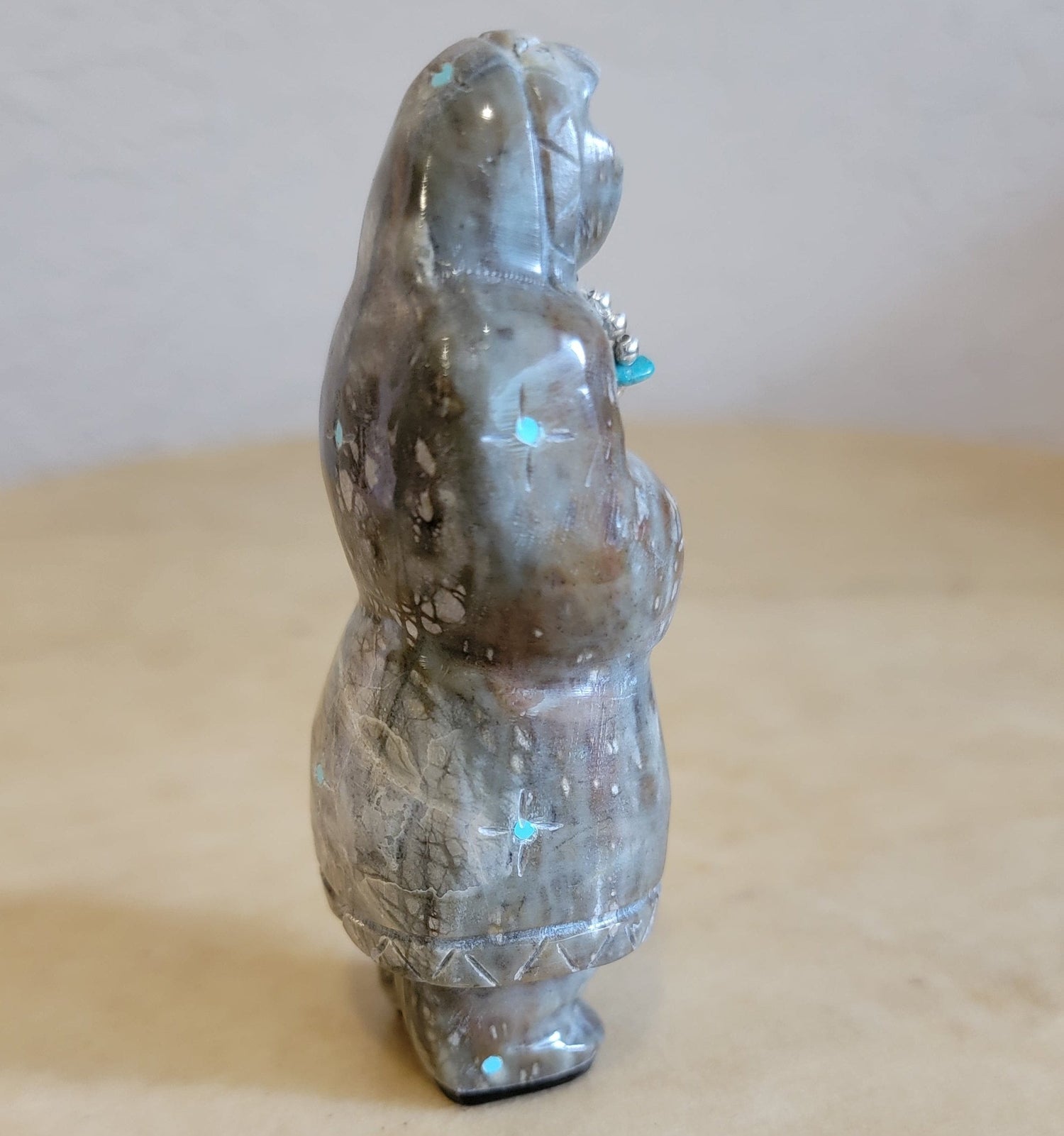 Medium: Travertine (Zuni stone) with pinshell eyes and soles on moccasins/ Turquoise appointments on etched shawl/ silver beads and turquoise nuggets necklace