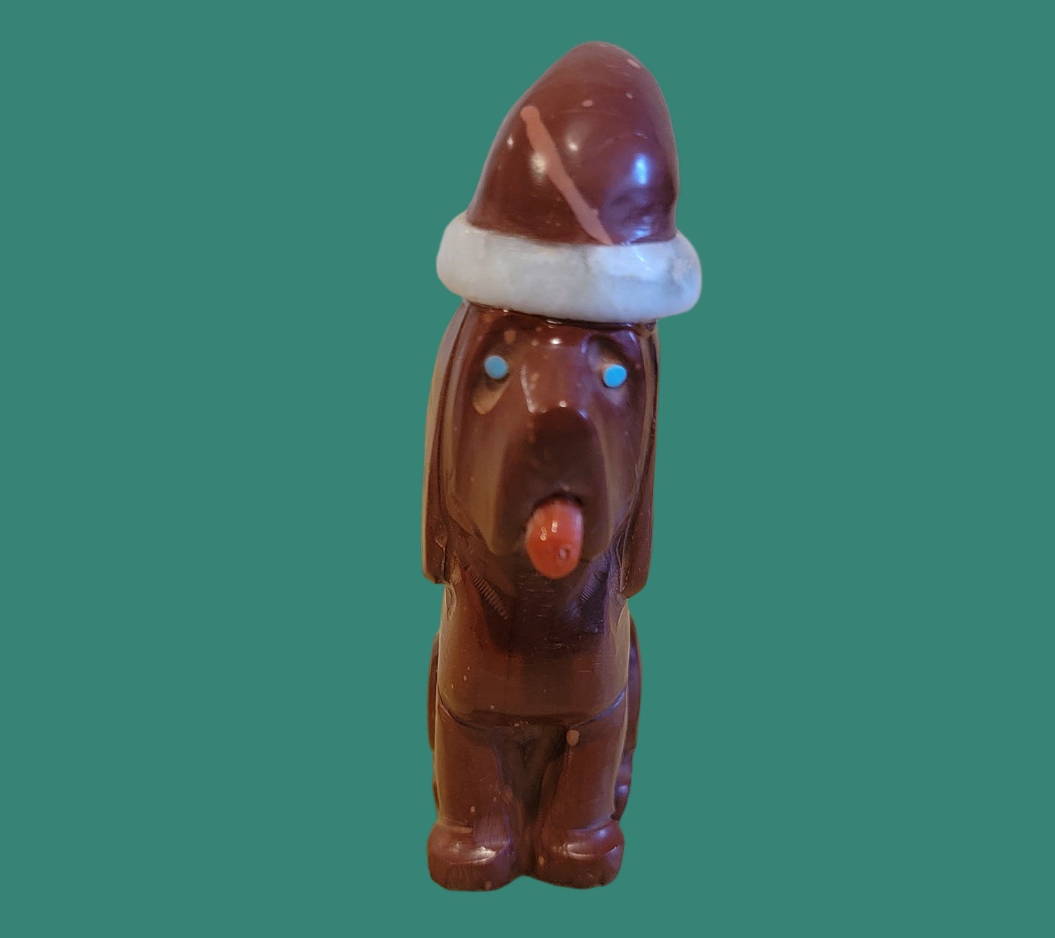 Medium: Pipestone pup with turquoise eyes and coral tongue/ Pipestone Santa hat with alabaster band and pompom