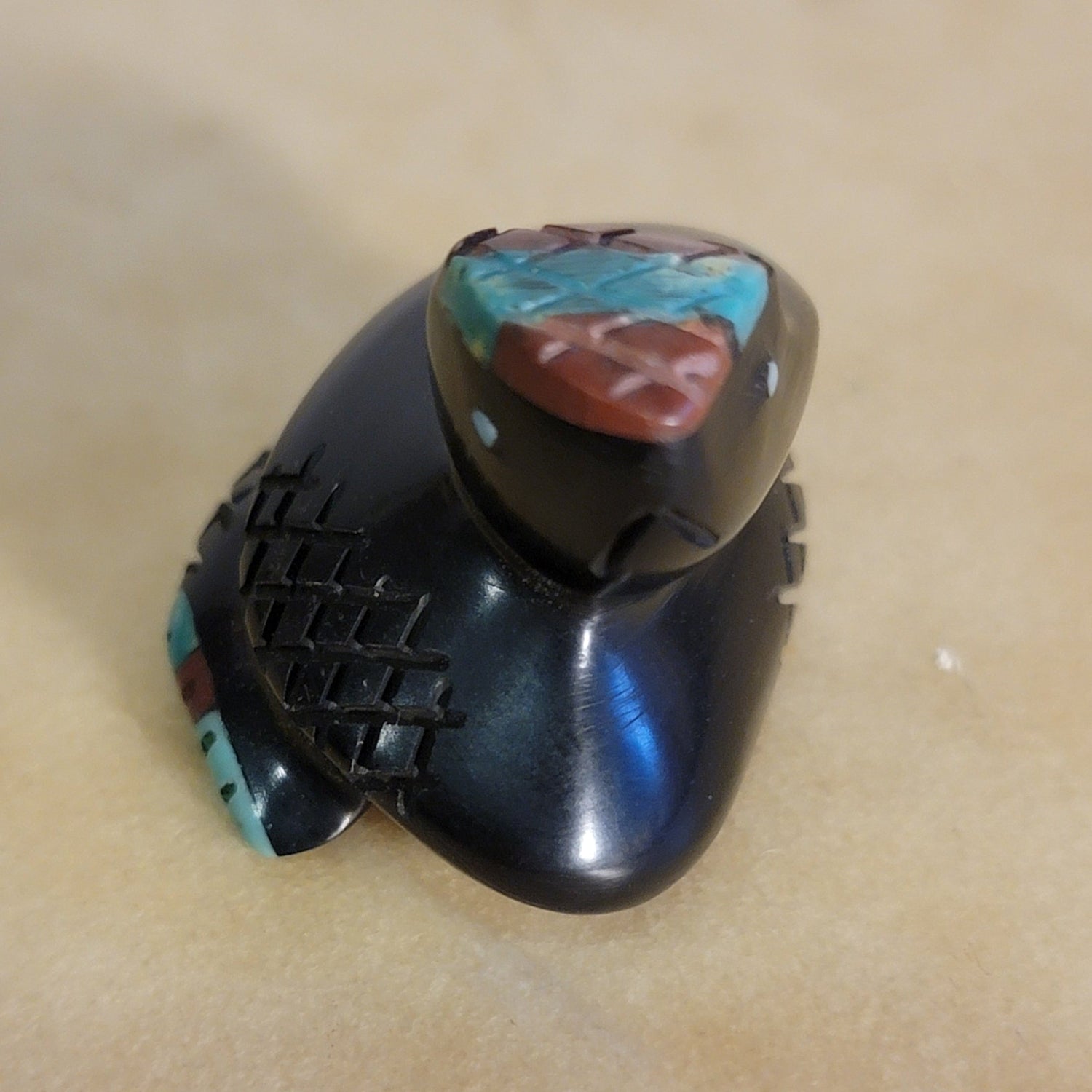 Medium: Black Jet with turquoise eyes/ Inlaid turquoise and pipestone rattles and top of head!