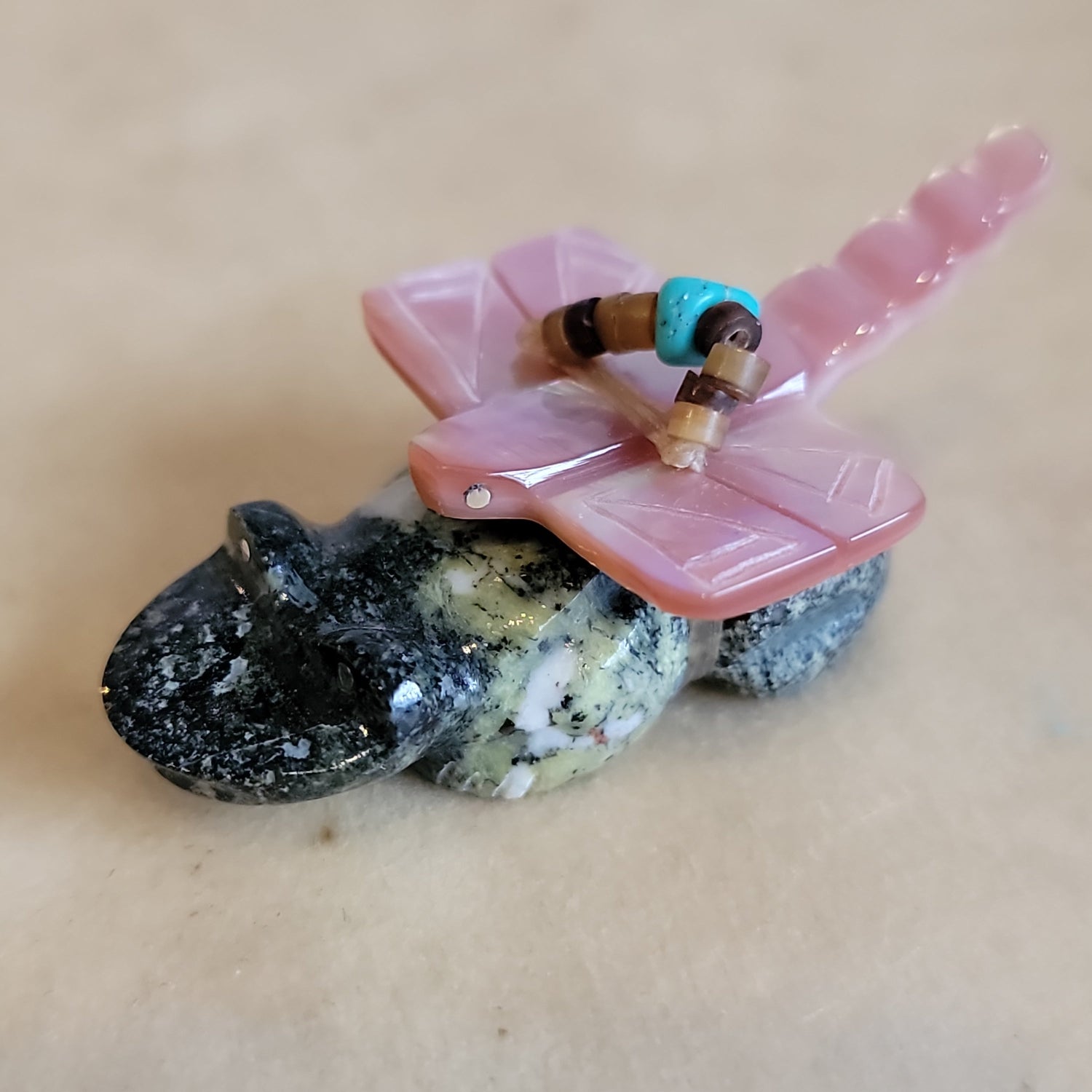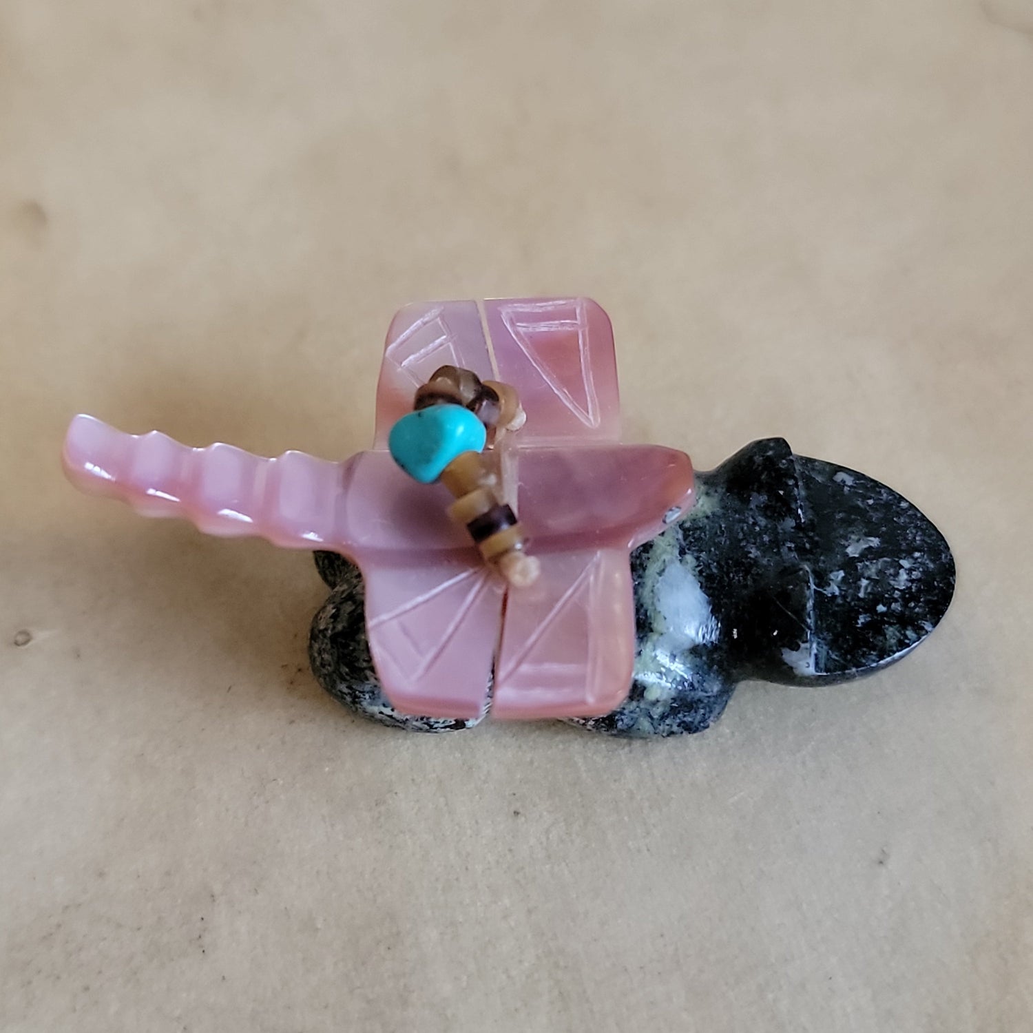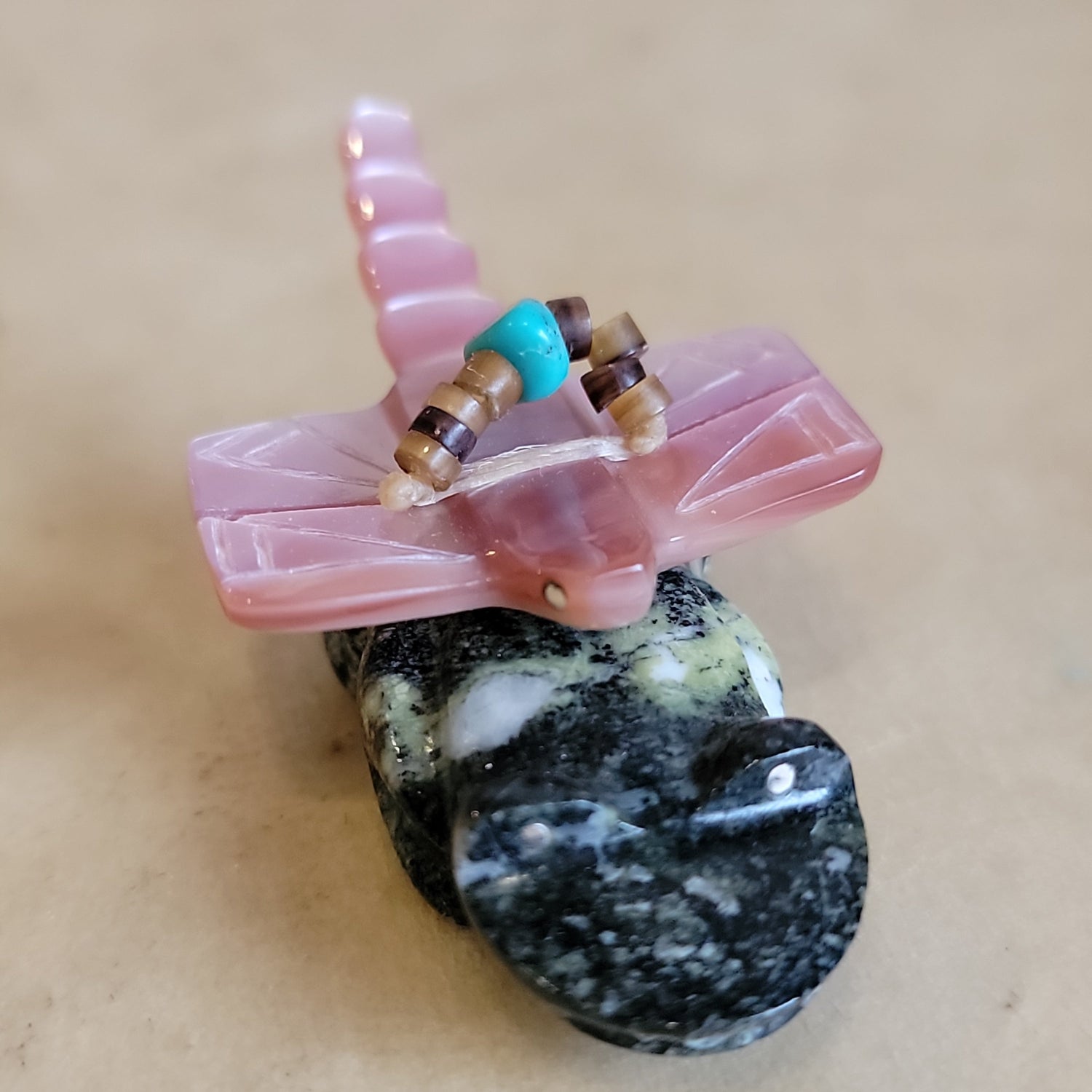 Medium: Serpentine frog/ pink mussel shell dragonfly, both with silver eyes/ stacked and bound with shell heishe and turquoise nugget