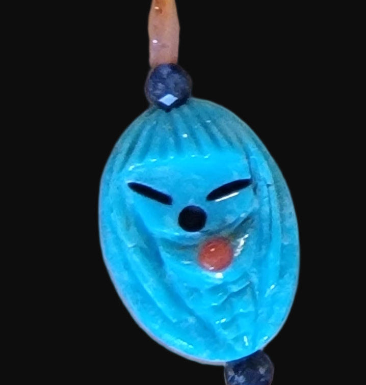 Medium: Nacozari Turquoise Double sided Zuni Maiden with jet eyes and mouth, coral appointment at neck and jet dragonflies and stars on opposite side/ one turquoise stone on each side of maiden with double sided dragonflies and jet stars/ Faceted Kyanite beads with Carnelian drops /Sterling silver clasp and chain fasteners