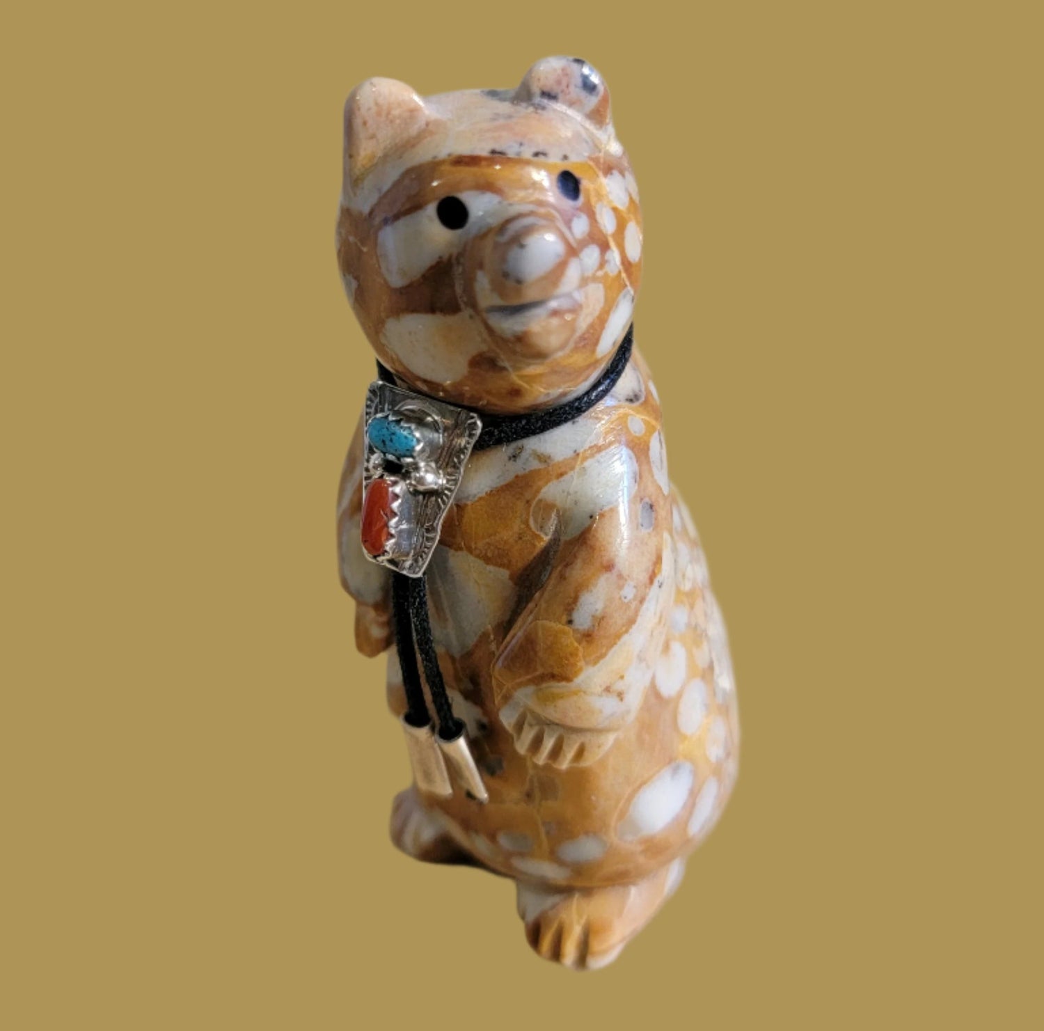 Tijillite Bear Snazzy Dude w/Sterling Silver Turquoise and Coral Bolo Tie Zuni Fetish