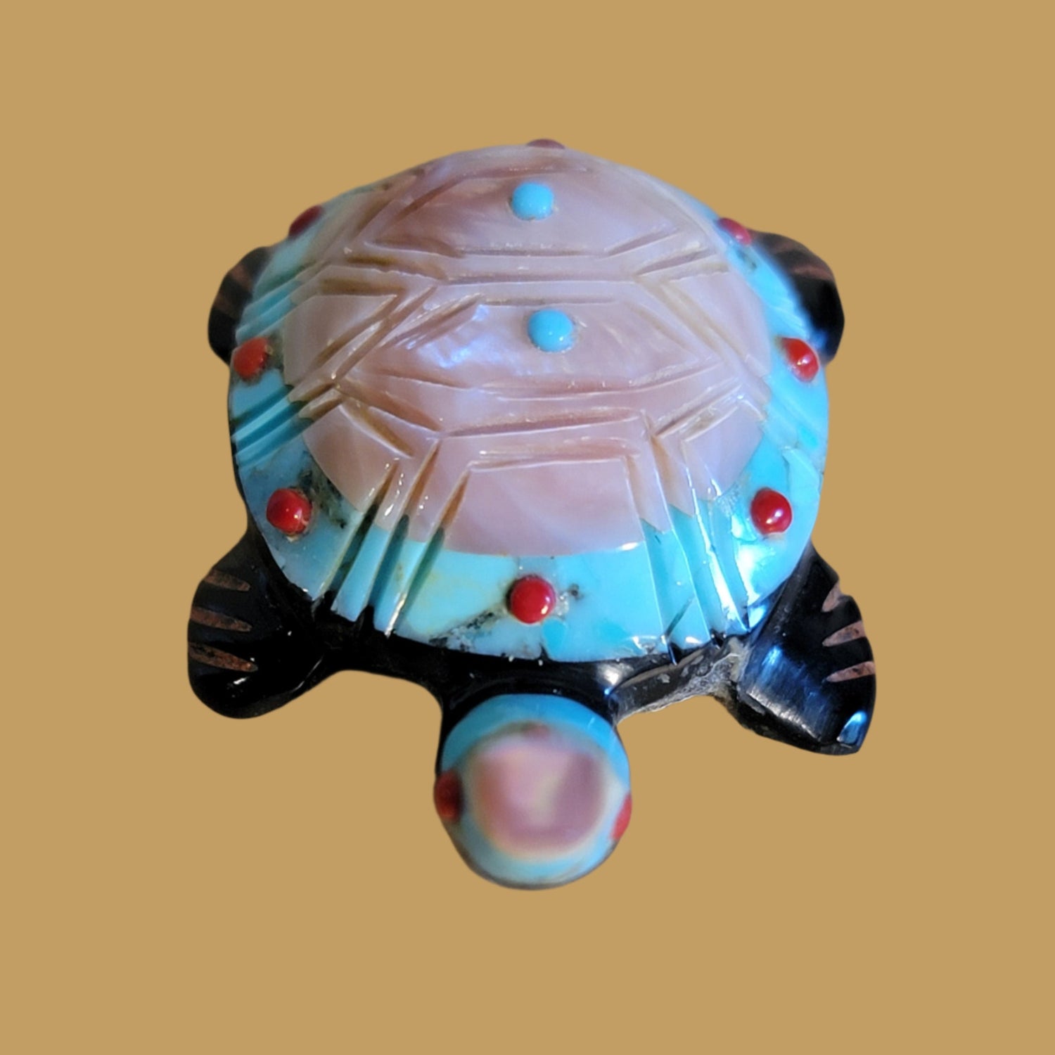 Beautiful Stone and Shell Layered Turtle Zuni Fetish is backordered and will ship as soon as it is back in stock.