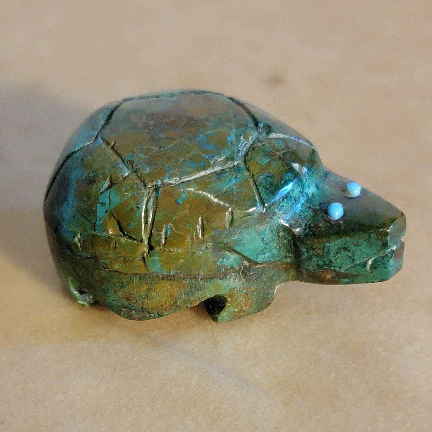 Medium:  A large and carved "shell" back turtle with inlaid turquoise eyes
