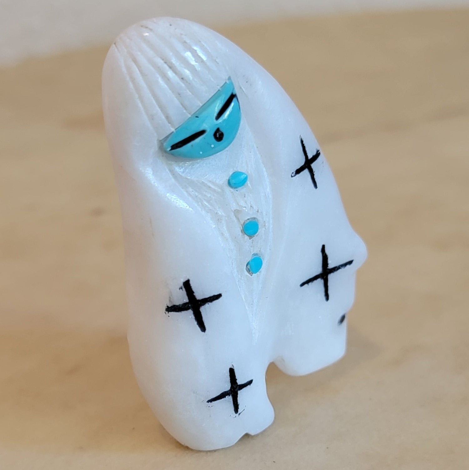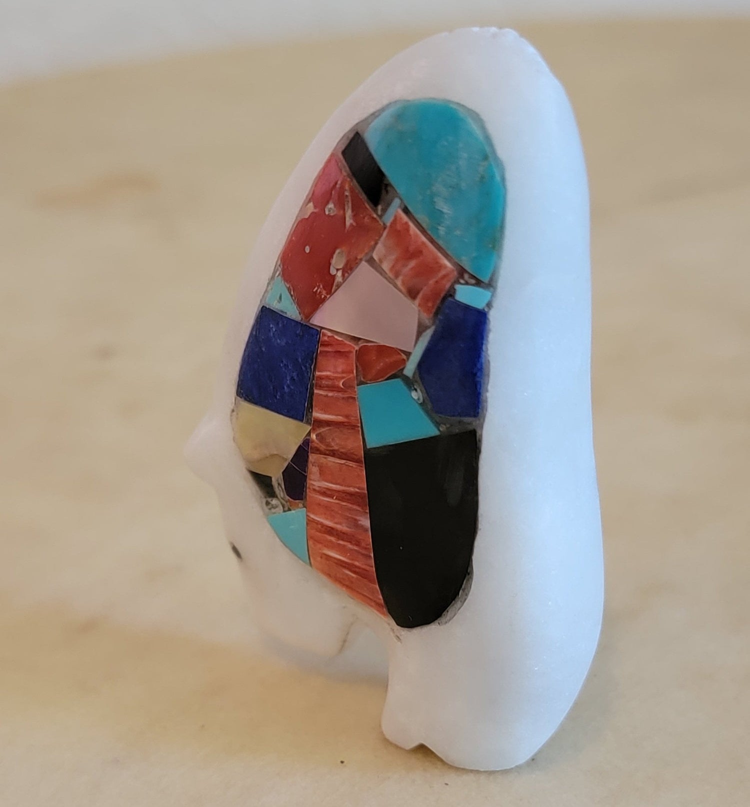 Medium: White Marble Bear with Maiden on one side with turquoise face with jet eyes and mouth/ Turquoise appointments/ Jet dragonflies on bear~shawl/ Turquoise eyes on Bear/ Opposite side has mosaic inlay with lapis /several shades of spiny oyster shell/various shades and sizes of turquoise along with black marble , Mother of Pearl and Abalone/ Stones and shells form a beautiful and colorful pattern!