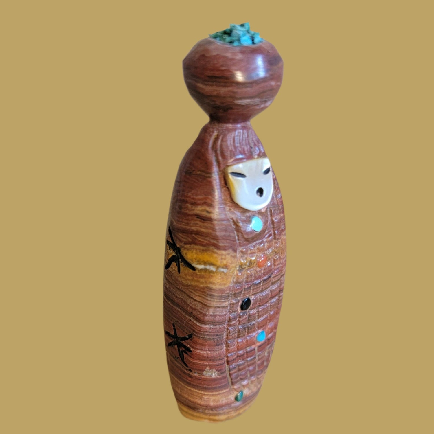 Medium: Onyx and jet eyes and mouth/Facemasks are turquoise and mother of pearl/ jet dragonflies on shawl /turquoise appointments at neck and turquoise coral malachite and jet appointments on corn maiden side/ Olla vessel has turquoise chips
