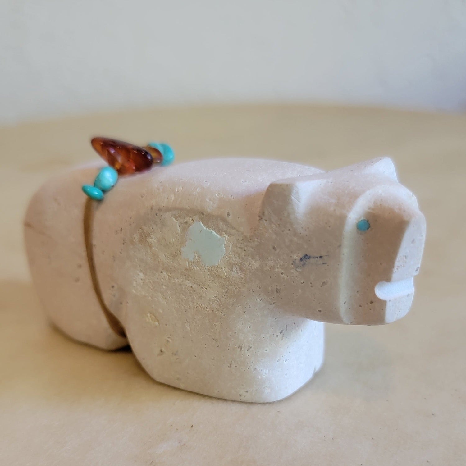 Medium: Smooth Sandstone w/ turquoise eyes with amber and turquoise nuggets offering. Unique "naturally occurring spirit stone" on right side
